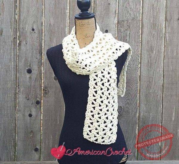 This beginner friendly, light and squishy Marshmallow Scarf crochet pattern makes a great accessory for Spring or any time of year. The stitches make it airy, but because it’s worked with a worsted or chunky yarn this lace scarf is also warm enough for cooler Spring weather. Beginners as well as more advanced crocheters will find this scarf project quick…